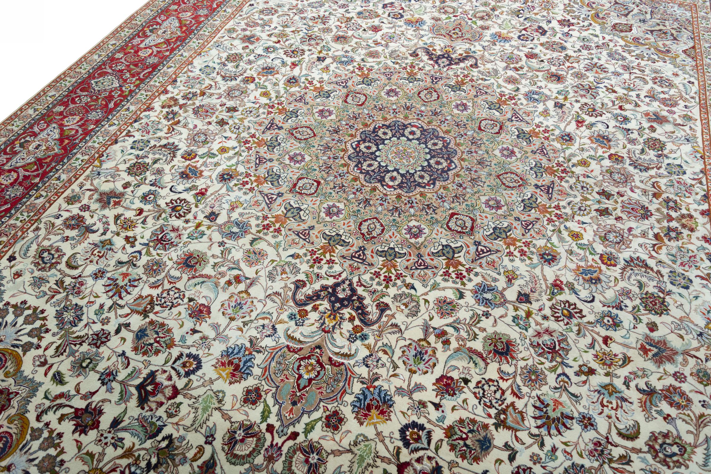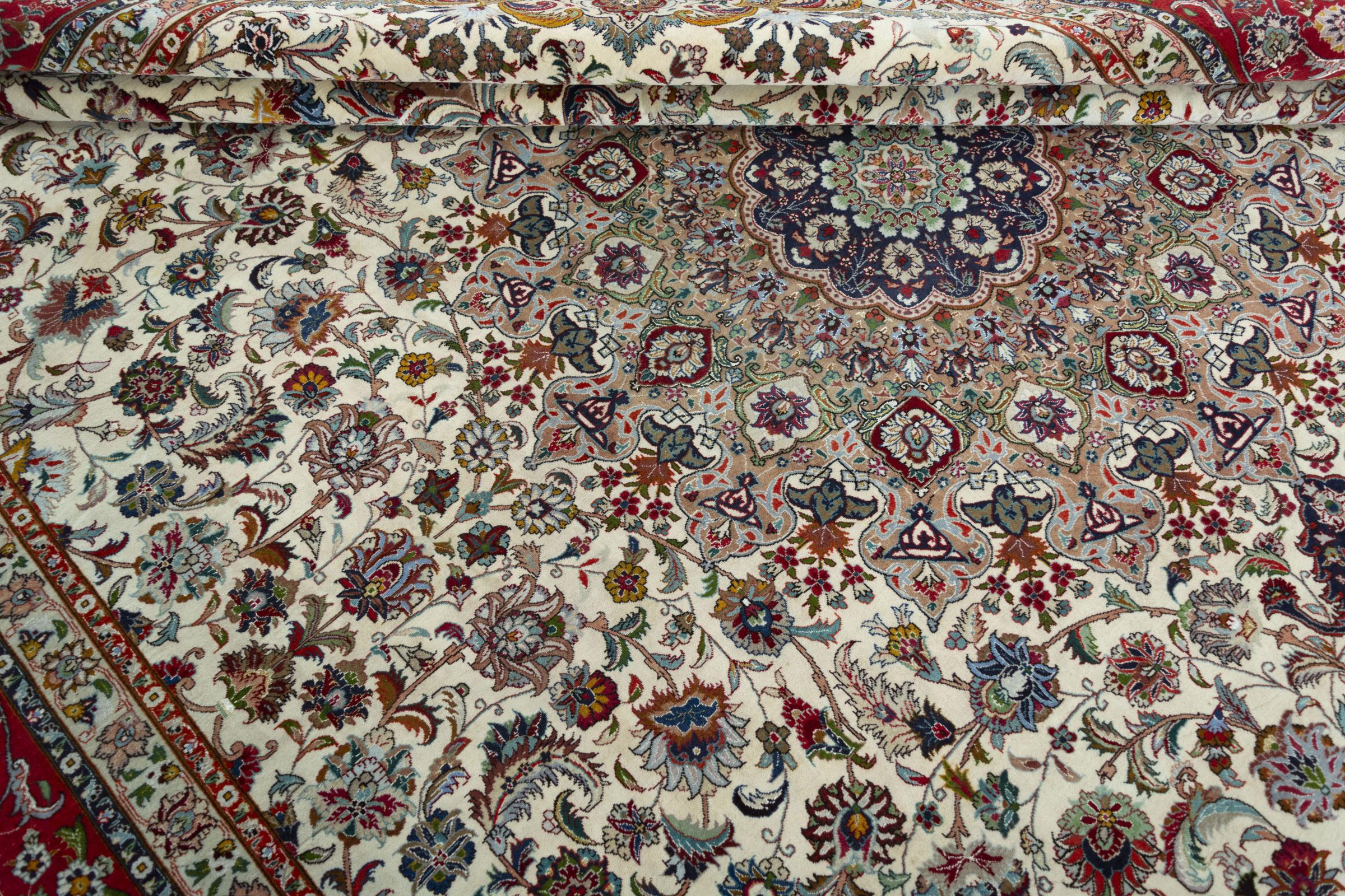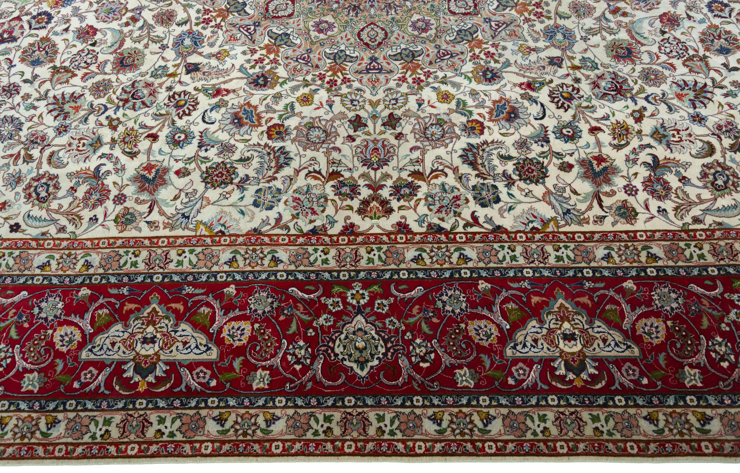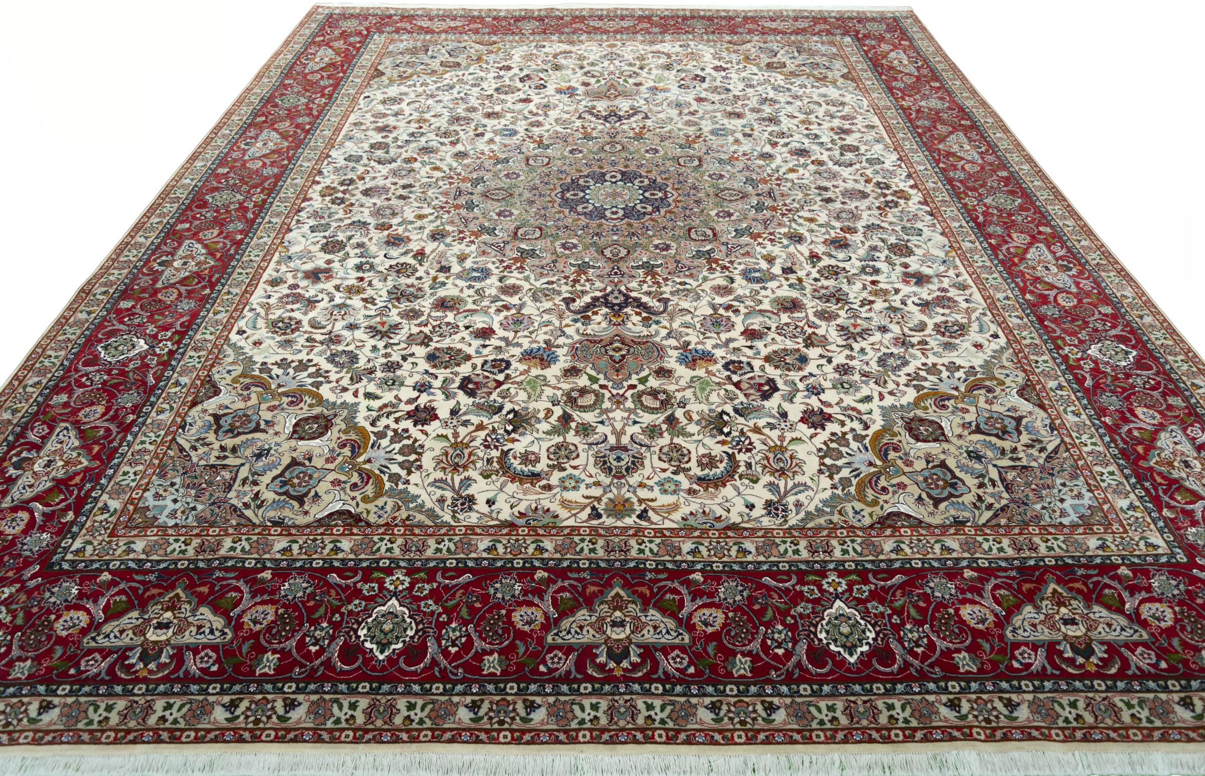 Tapijt ID: 285301005901050 Grootte: 406x304 cm Dikte: ap. 7 mm Knoopdichtheid: 450 000 - 500 000 / m² Verwerking: Handgeknoopte Pool: Kurkwol met zijde Schering: Katoen Oorsprong: Perzië / Iran Leeftijd: Nieuw Gewicht: ap. 37 kg Ook wel bekend als Tabriz, Tabris, Täbris, Tebriz, Tebris, 40Raj, 50Raj Op voorraad: Uniek - Nog maar 1 op voorraad