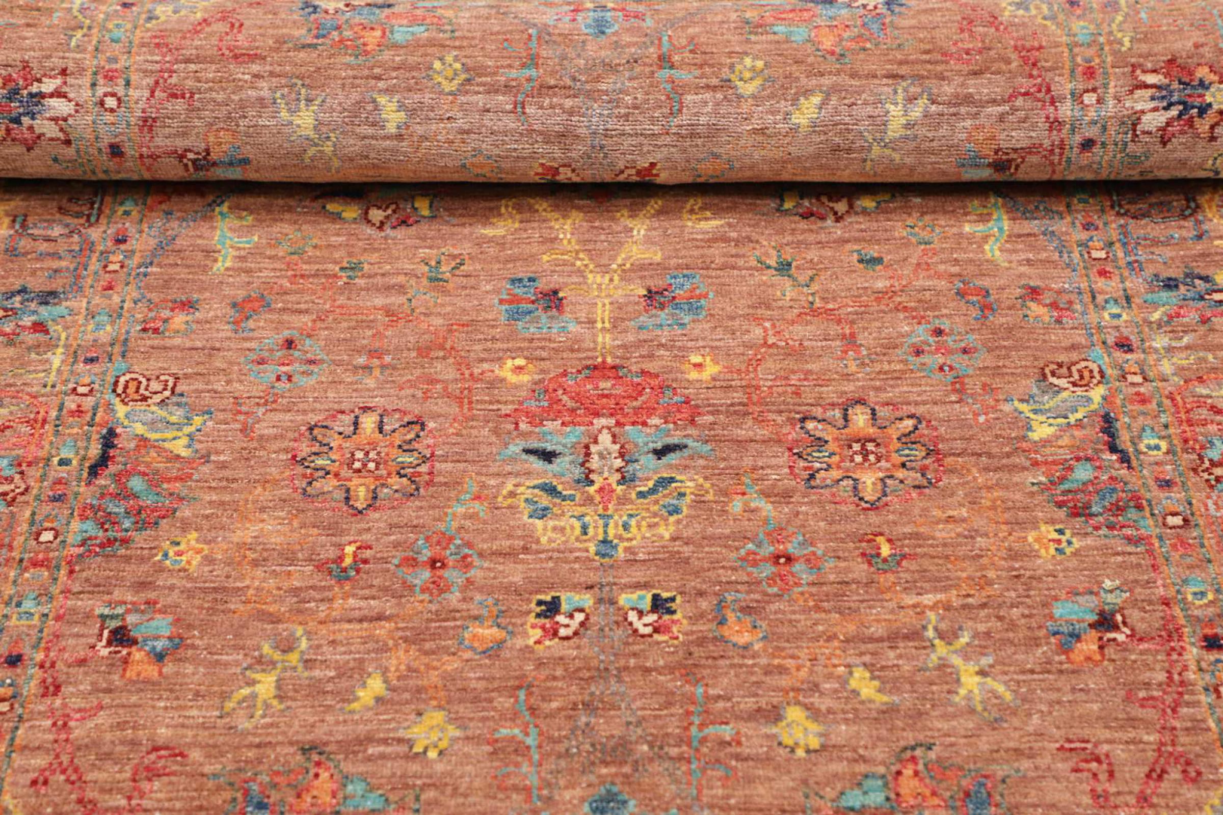 Dit tapijt is gemaakt van handgesponnen schapenwol van de hoogste kwaliteit. Vooral in Iran (voormalig Perzië), Afghanistan en Pakistan wordt de wol nog met de hand gesponnen voordat het eigenlijke knopen van het tapijt begint. Wol heeft zich door de eeuwen heen bewezen als een natuurlijk en extreem slijtvast materiaal. Het heeft onder andere vuilafstotende en warmte-isolerende eigenschappen. Tegelijkertijd is wol onvergelijkbaar zacht en heeft het een natuurlijke glans.