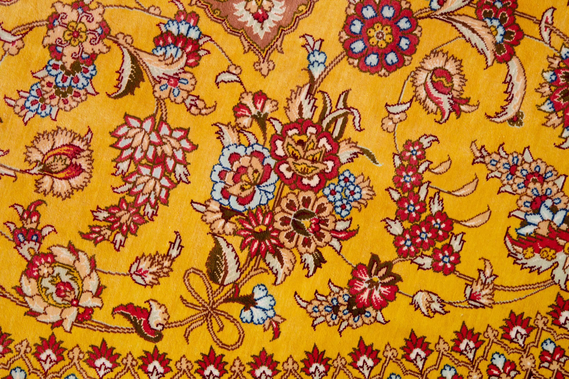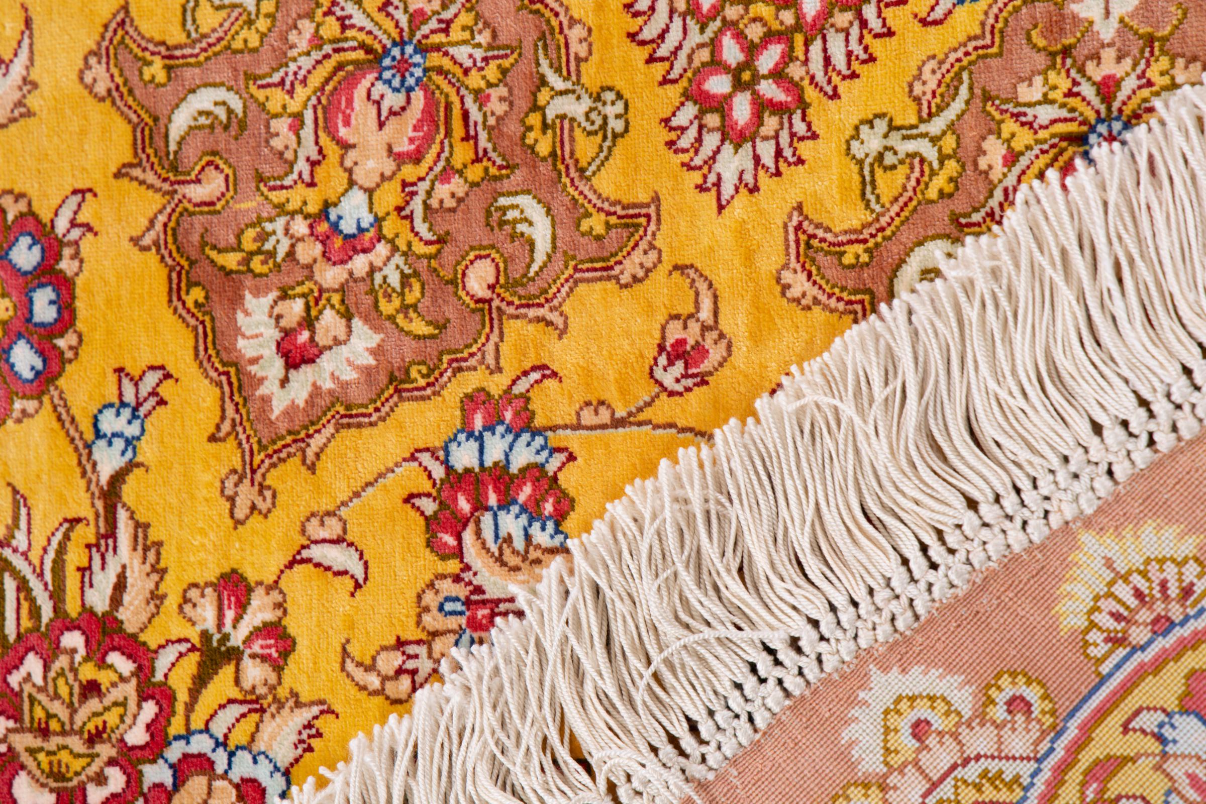 Dit Ghom zijden vloerkleed is pure luxe. De ornamenten en de pure natuurlijke zijde spreken boekdelen. Hier vind je de Oriënt in zijn volle perfectie voor bij jou thuis. Een zijden tapijt van Ghom maakt zelfs indruk op verzamelaars van Perzische tapijtkunst. Afhankelijk van de lichtinval laat de zijde kleuren schitteren in de meest uiteenlopende facetten. Dit maakt dit Perzische tapijt tot een onvergetelijk hoogtepunt en laat je kamer stralen in een gezellige en zeer hoogwaardige sfeer.