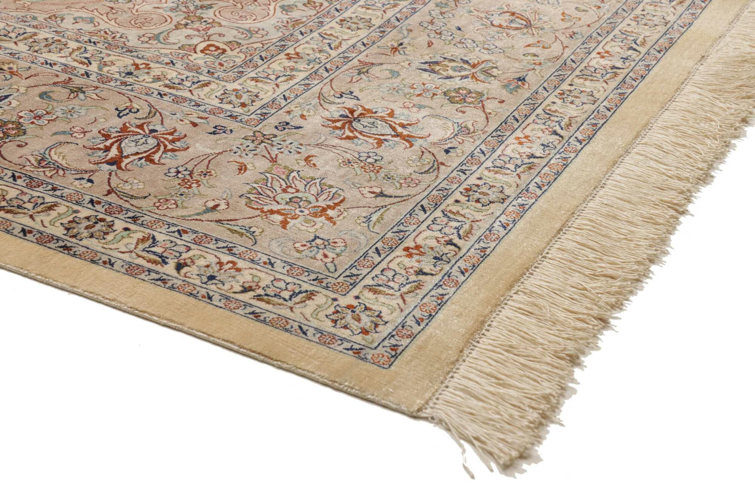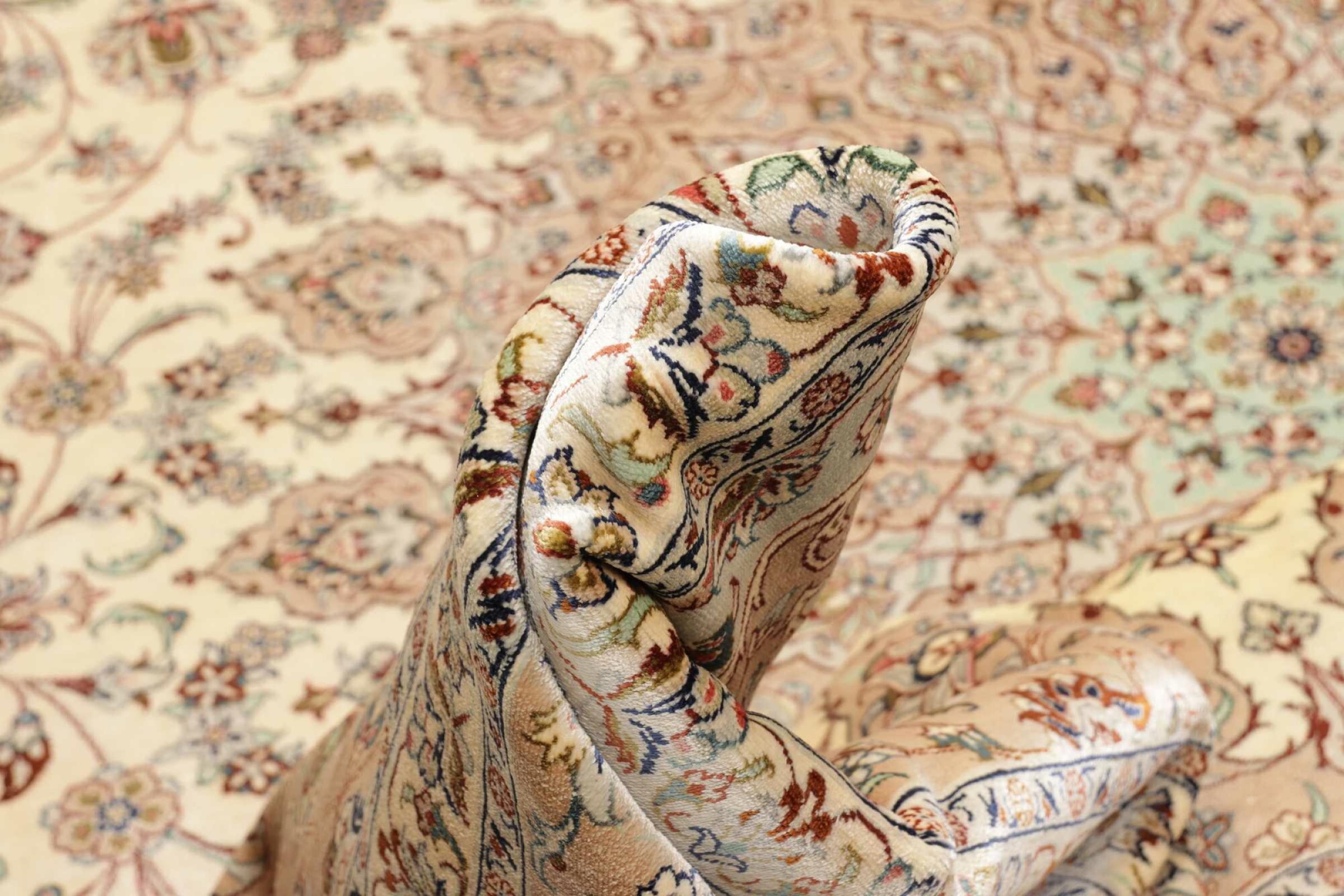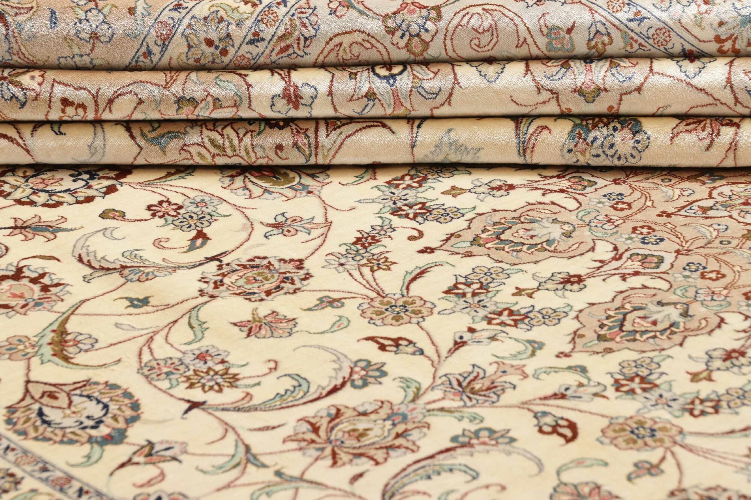 Dit Ghom zijden vloerkleed is pure luxe. De ornamenten en de pure natuurlijke zijde spreken boekdelen. Hier vind je de Oriënt in zijn volle perfectie voor bij jou thuis. Een zijden tapijt van Ghom maakt zelfs indruk op verzamelaars van Perzische tapijtkunst. Afhankelijk van de lichtinval laat de zijde kleuren schitteren in de meest uiteenlopende facetten. Dit maakt dit Perzische tapijt tot een onvergetelijk hoogtepunt en laat je kamer stralen in een gezellige en zeer hoogwaardige sfeer.